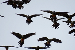 Wir „nisten“ uns für drei Tage auf demtypisch argentinischen Camping Trentinos ein. Erst wird Wäsche gewaschen … dann laufen wir 500m zur Steilküste. Das laute Gekrächze ist trotz lautem Wind schon bald zu hören. Was für ein Spektakel … die Loros fliegen über unsere Köpfe hinweg, landen vor den Höhlen, fliegen wieder weg, landen. Durch unser Näherkommen sind sie sehr aufgeregt … überall wimmelt es von diesen wunderschönen, gelb-grün-blau-roten Papageien. Heute haben wir uns mit zwei Cameras bewappnet … es ist schwierig, diese aufgeregten Vögel lassen sich nicht einfach fotografieren.