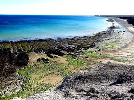 Ein tolles Plätzchen … bei Flut können wir die Kolosse, meist ist es die Mutter mit ihrem Jungem, gut beobachten und heran schwimmen sehen. Bei Ebbe sind sie zum fotografieren zu weit draussen … vor uns liegt das schroffe Riff und die grünen Algenteppiche.