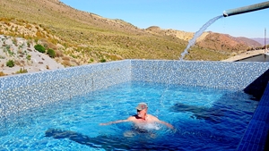 Wir sind mutig und fahren für den Abend noch ein paar Kilometer weiter zu den Termas Jurasi … die liegen nochmals 400m höher. Wir stehen ruhig und allein auf dem Parkplatz … die Nacht überstehen wir ohne Kopfschmerzen. Claro, daß wir vor unserer Weiterfahrt in die Pools gehen. Es ist Niemand vor Ort, der unsere 2.000 Pesos p.P. entgegen nimmt … wir gehen trotzdem. Das heisse Quellwasser kommt aus dem Berg … füllt die Pools und läuft als warmer Fluß weiter. Die natürlichen Becken sind uns mit 50 Grad zu heiß … das geflieste Becken scheint täglich mit neuem Wasser gefüllt zu werden und entspricht mit ca. 30 Grad angenehmen Badewasser-Temperaturen.