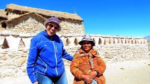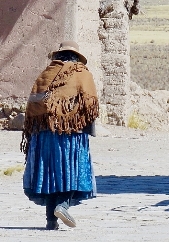 Auf der Rückfahrt ins Dorf Sajama nehmen wir noch eine einheimische Bäuerin mit. Wenn sie keinen Lift bekommt, muß sie diese Strecke von 8 Kilometern täglich zweimal laufen … bei ihren kurzen Beinen sind das doppelt so viele Schritte, wie bei mir.