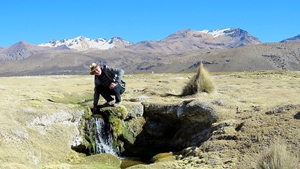 Wir können uns hier noch mit frischem Quellwasser versorgen ... geniessen den Blick auf auf den 5.439 m hohen Cerro Larancagua.
