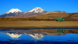 Zum Glück gibt es einen breiten Randstreifen … wenn nicht, gehe ich mit dem Walki-Talki bis zur nächsten Ausweichstelle vor. Zwischendurch versuche ich immer wieder mal einen Fotoblick auf die kobaltblauen Lagunen zu erhaschen. Auch den Vulkan Parinacota bekomme ich fast als komplettes Spiegelbild auf dem Lago Chungara zu sehen.