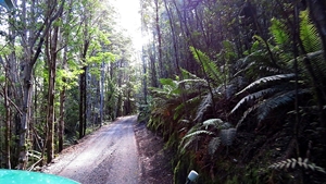 Der einspurige Schotterweg geht die ersten Kilometer übersichtlich und eben durch eine offene Graslandschaft … bei Gegenverkehr ist genügend Platz, um auf die Wiese auszuweichen. Wir erreichen eine Gabelung … laut Plan müßte hier jetzt nach links die Einbahnstraße des Rundweges beginnen. Komisch … der rechte Teil, nämlich das Ende der Rundstrecke ist gesperrt. Wir haben den Wald erreicht … die Strecke wird knätschig, dunkel, steil und sehr, sehr eng … noch enger ein paar Brücken. 4X4 ist angesagt … die Wegesränder sind weich und es geht streckenweise sehr steil runter. Noch immer nicht sicher, ob uns hier ein Fahrzeug entgegenkommen darf, manövriert Sigo unseren Pummel geschickt zwischen den eng stehenden Bäumen durch.