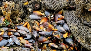 Bei der Ankunft in dem betriebsamen Hafen von Quellon ist leicht zu erkennen … hier dreht sich Alles um die Muscheln. Säckeweise werden die Muscheln von den bunten Fischerbooten entladen.