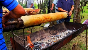 Kartoffel-Kloß-Teig wird an ein übergroßes Nudelholz gebappt und über dem Feuer gebacken … sehr lecker!