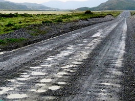 Wir stehen mit dem Auto auf einer Anhöhe … sehen, wie der starke Wind im Tal die Wellen über die Lagune und über die Straße peitscht. Hm … wir müssen da durch, sonst fegt es uns hier oben weg. Mit Vollgas jagd Sigo unseren Pummel die Waschbrett-Piste runter … in der offenen Talmulde beschießt uns der Sturm mit taubeneiergroßen Kieselsteinen, der Scheibenwischer packt gerade so die Wassermassen. Auf der anderen Seite angekommen, sind wir wieder im Windschutz eines Berges. Ein Blick in den Rückspiegel … zum Glück keine zerschossene Scheibe!