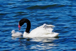 Unsere Beobachtungen am Fjord sind mal wieder sehr niedlich … Schwarzhals-Schwäne schwimmen mit ihren Jungen am flachen Ufer entlang. Wie aus einer Fähre kommen nach und nach die Kleinen unter den Flügeln der Alten herausgekrabbelt … oder lassen sich auf der Lookout-Ebene spazieren schippern.