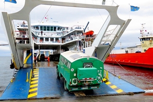 Und schon wieder gibt es für uns eine Wiedersehens-Überraschung.… Doris und Siegmund, die mit Willis Grüner Minna zur Zeit unterwegs sind, sind mit an Bord der Fähre. Siegmund steht auf dem Oberdeck, um uns bei der Auffahrt zu filmen.